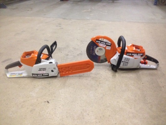 Häcksax , trimmer och sopmaskin finns sedan förut i vårat batterisortiment för uthyrning