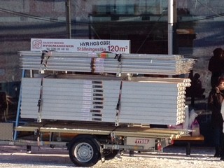 Komplett ställning lastat och klart på släpvagn, aluminium detaljer enkel att bygga. 120m2 kan byggas i olika varianter.